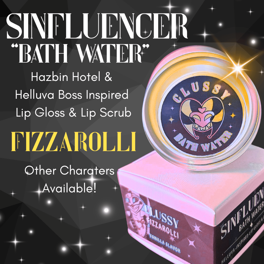 Inspired by Influencers, this "Sinfluencer Bathwater" is a lip balm/lip scrub combo featuring some of your favorite Hazbin Hotel and Helluva Boss characters! Vegan & Cruelty Free, this cute cosmetic comes with holographic labeling and fun packaging.