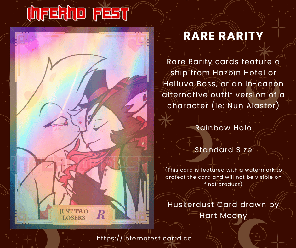 Rare: Features fun character ships and alternate "canon" designs (ie: Nun Alastor) with a rainbow holo