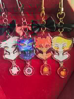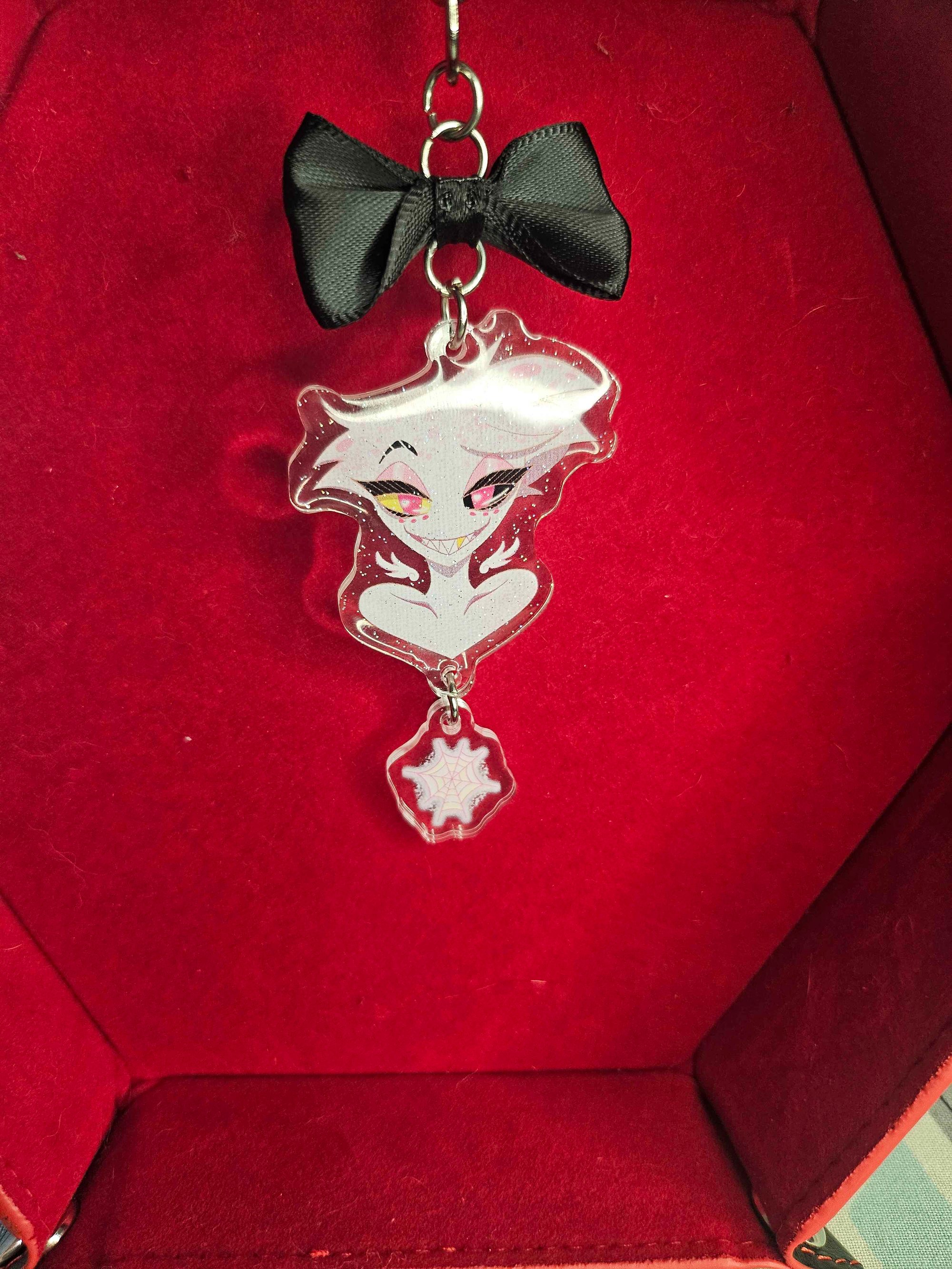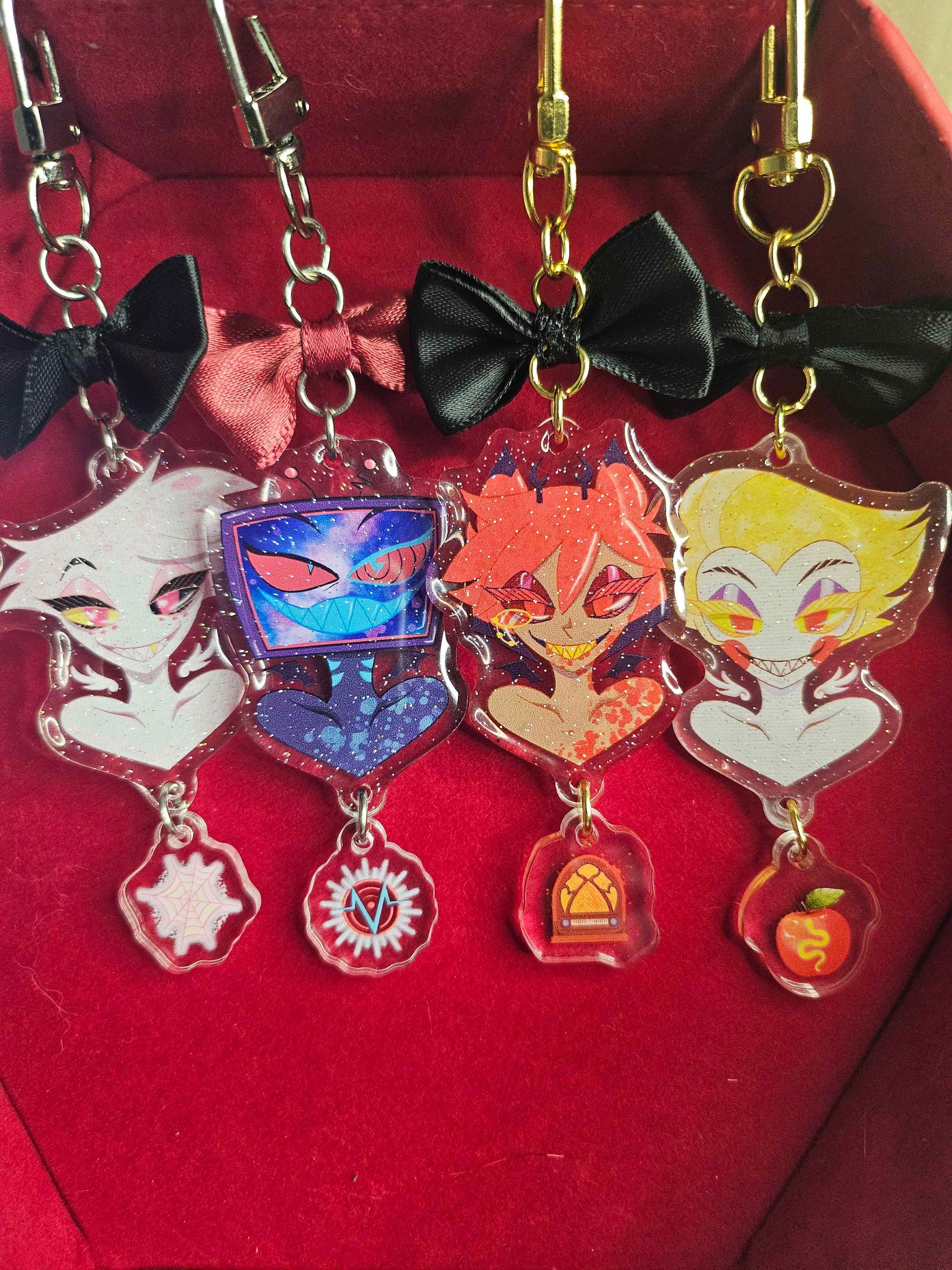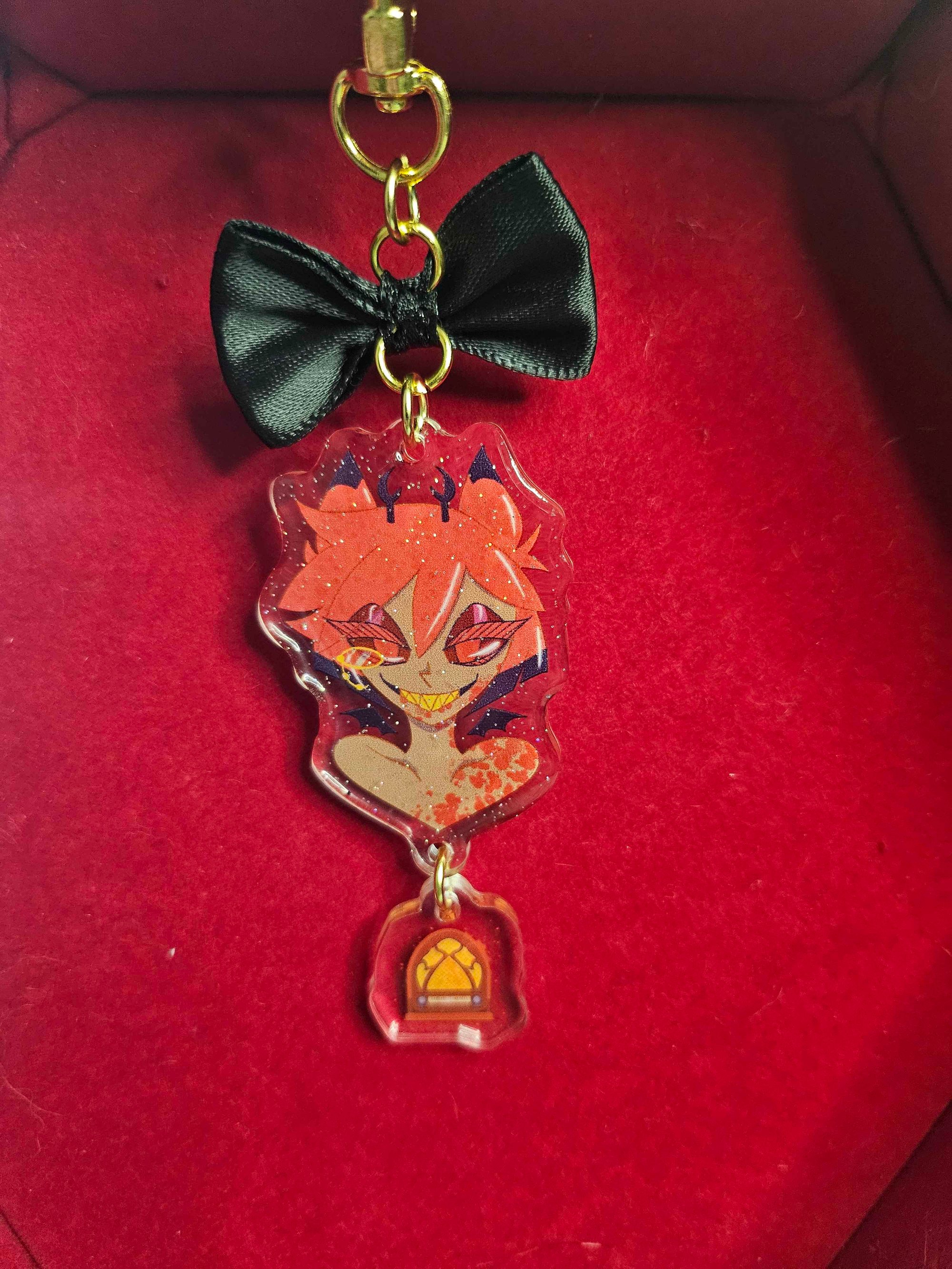 Brand new product created by Eruditiouscrown on X! A cute little bow tops one of your favourite characters followed by a cute little dangly. They have water colour markings with a glittery overlay to diversify your itabag. We know you've got one.
